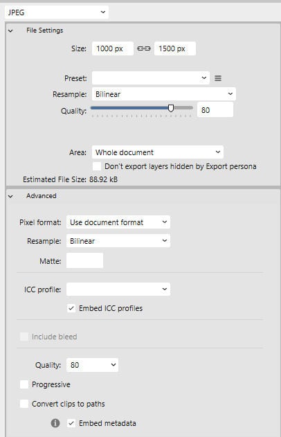 Since you cannot share projects with most of your relatives or colleagues, you need to save your work in a .jpg format. However, as you saw above, Affinity only "saves" in its native format. If you need any format other than .afphoto, you will need to go through File > Export... This is the dialogue window you will get and you can choose JPEG in the drop down list of available formats.