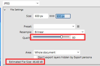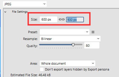 Although you could resize your file before extracting it, Affinity allows you to choose the dimensions at this point. For example, if you need to resize your project to post in the forum, you can enter the 600 pixels on the first field (horizontal), and then click on the second one where you will see the vertical value automatically adjust. That is because the link icon between both fields indicate that the adjustment will be automatic.