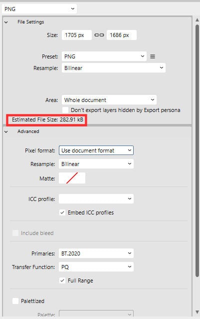 Notice that you also get the Estimated File Size, however, unlike for the .jpg format, you have to control over that size, so you can only use it as a guide to inform you.